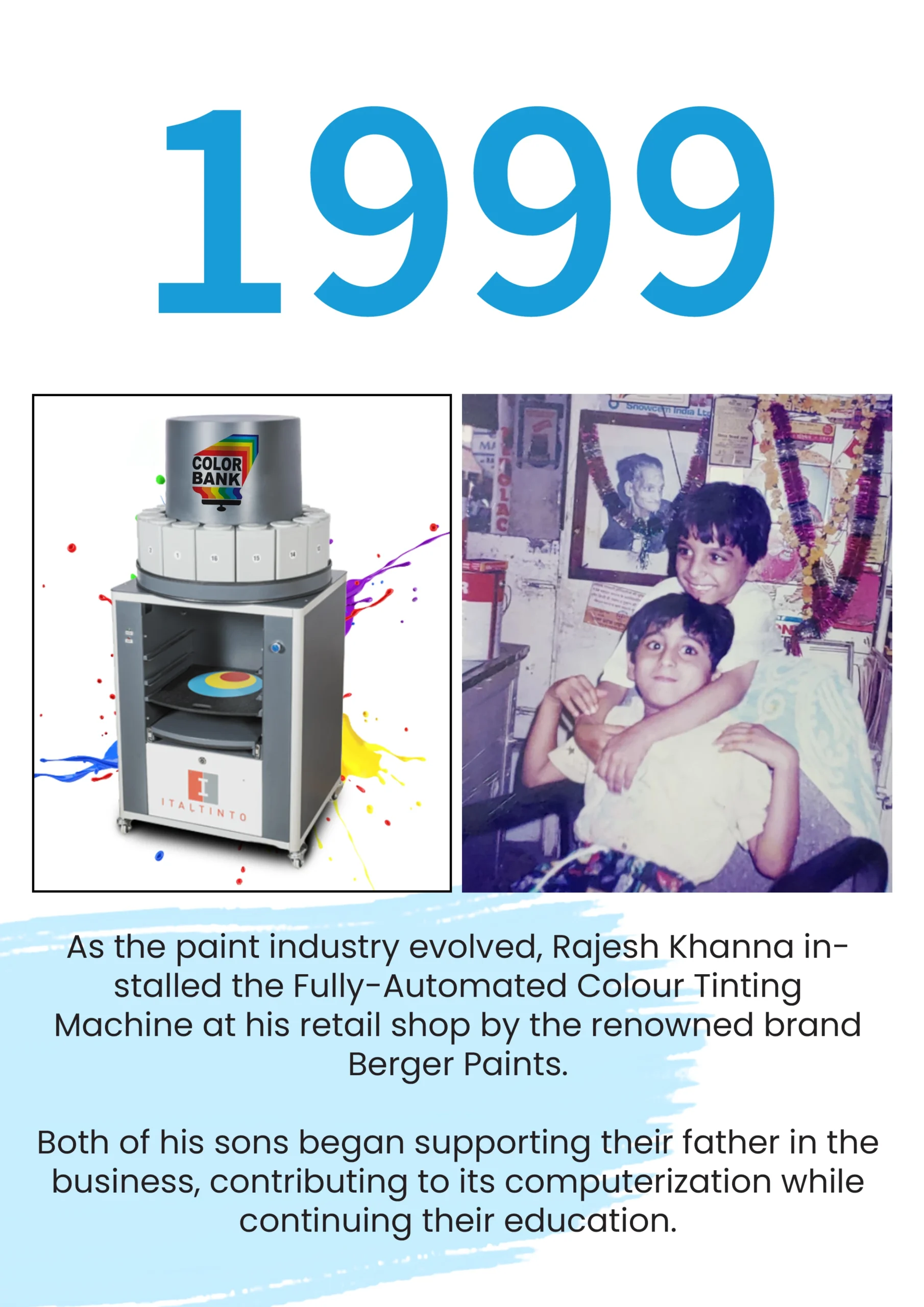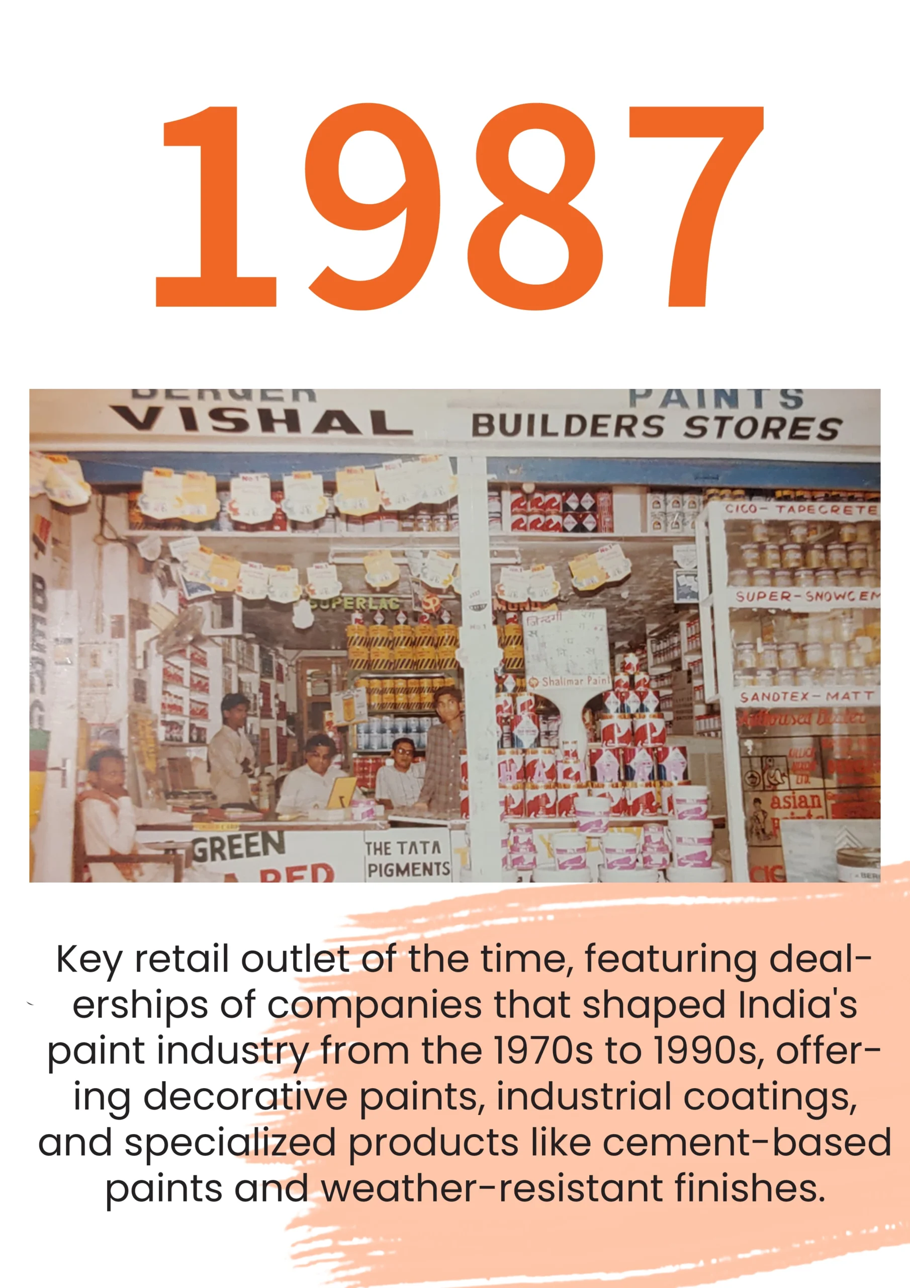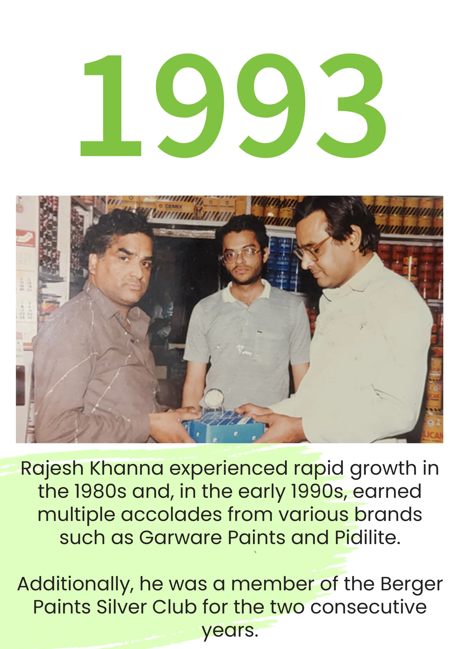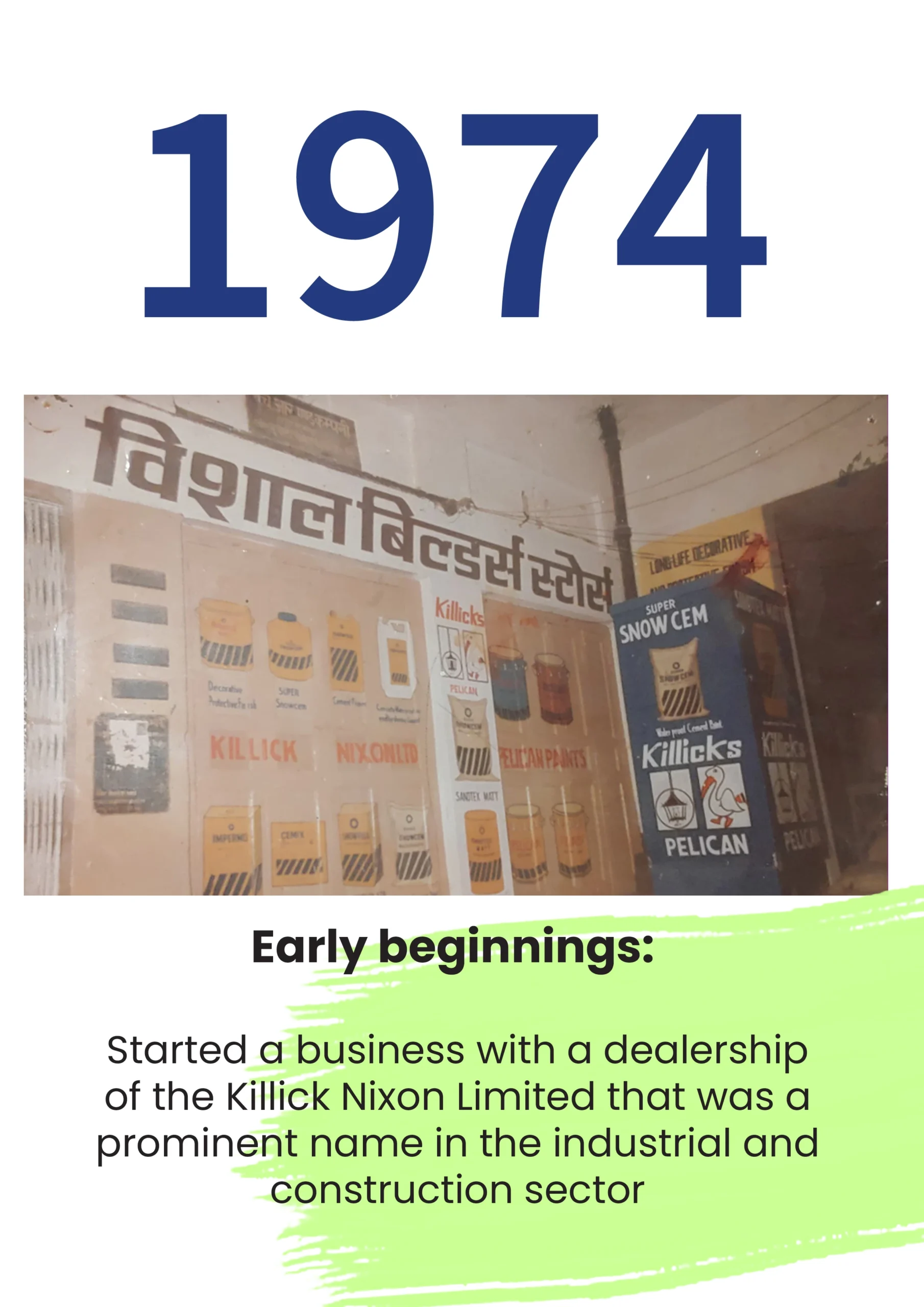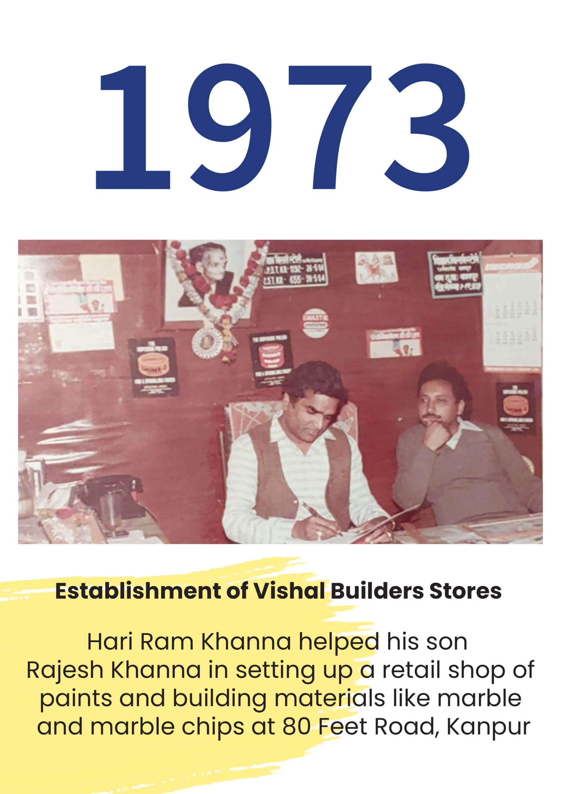 Founded in 1973 by Late Hari Ram Khanna and his son, Rajesh Khanna, Vishal Builders Stores (VBS) began with Killick Nixon Limited’s products, Snowcem and Super-Snowcem, and marble trading. Over the years, it expanded into a multi-brand retail outlet with top paint industry dealerships. In the 1980s, VBS partnered with leading brands like Berger Paints, Asian Paints, and Shalimar Paints, gaining recognition such as membership in Berger’s Silver Club (1990-92) and winning the Fevicol Display Contest. In 1999, VBS modernized with a Fully Automated Color Dispensing Machine.